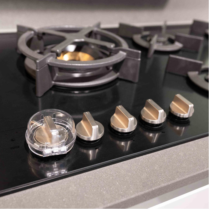 La copertura per manopole del piano cottura (set da 2 pezzi) aumenta la sicurezza in cucina impedendo al bambino di accedere ai comandi dei fornelli.