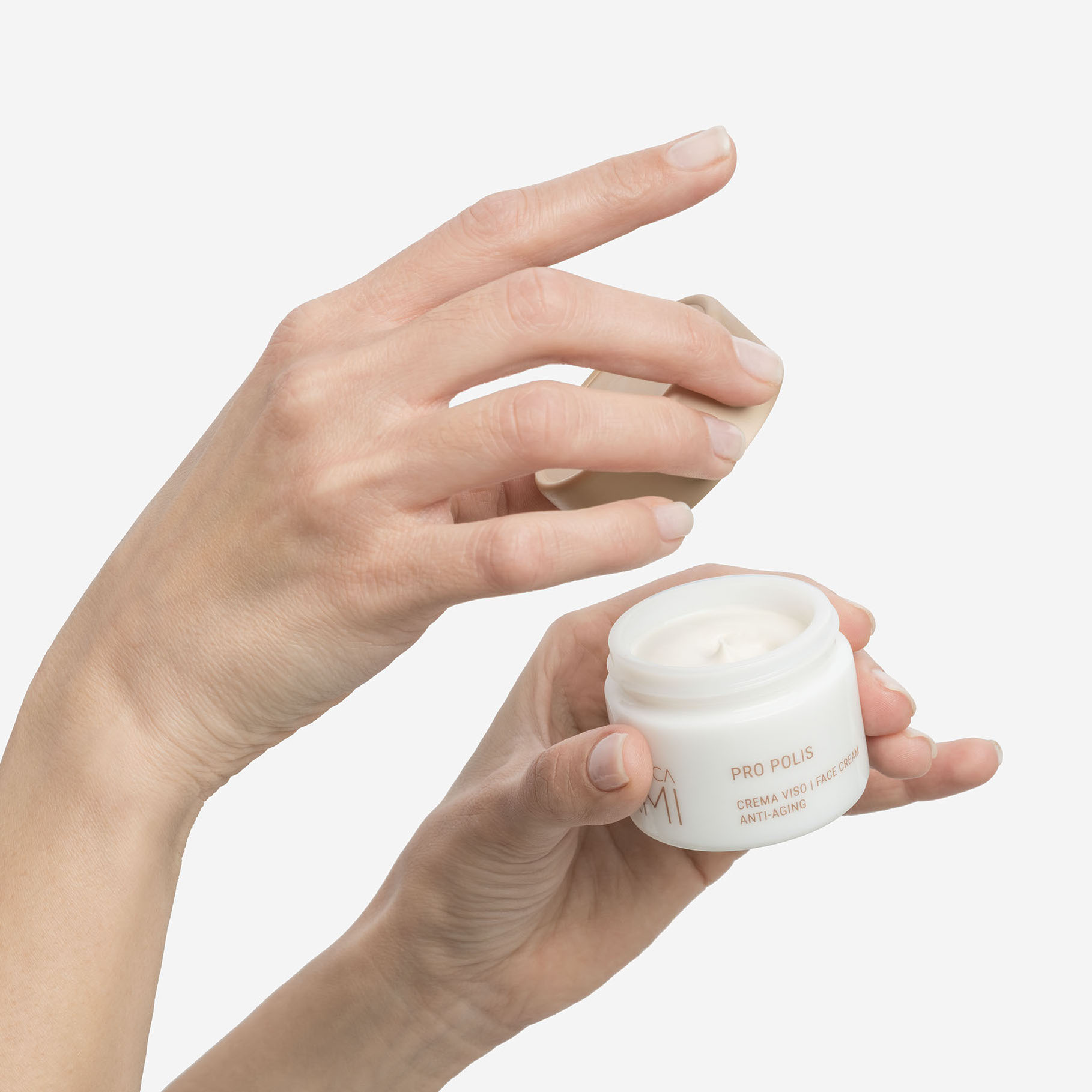 INCI:AQUA, BUTYROSPERMUM PARKII BUTTER, SQUALANE, GLYCERYL STEARATE CITRATE, C8-12 ACID TRIGLYCERIDE, CAPRYLYL CAPRYLATE/CAPRATE, CERA ALBA, MEL(*),ORYZA SATIVA BRAN OIL, POLYGLYCERYL-3 RICE BRANATE, PRUNUS ARMENIACA KERNEL OIL,HELIANTHUS ANNUUS SEED OIL(*), GLYCERIN, PROPOLIS EXTRACT, HYALURONIC ACID,CERAMIDE NP, OLIVE GLYCERIDES, ROSMARINUS OFFICINALIS LEAF EXTRACT, TAPIOCA STARCH, ACACIA SENEGAL GUM, XANTHAN GUM, SODIUM BENZOATE, POTASSIUM SORBATE, ALCOHOL(*), SODIUM DEHYDROACETATE.