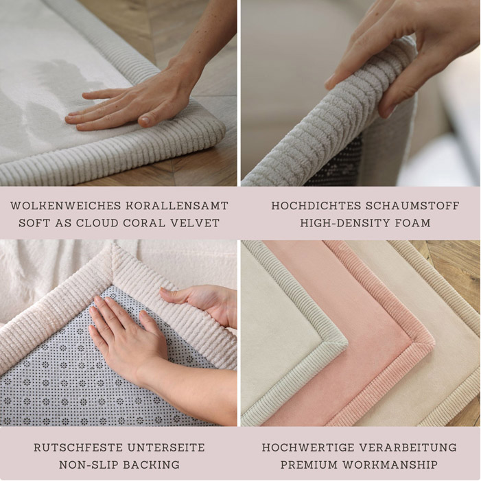 - Composto da tre strati: 1. velluto corallo per la massima morbidezza, 2. memory foam resistente per giocare e gattonare comodamente, 3. supporto antiscivolo per proteggere da urti e cadute