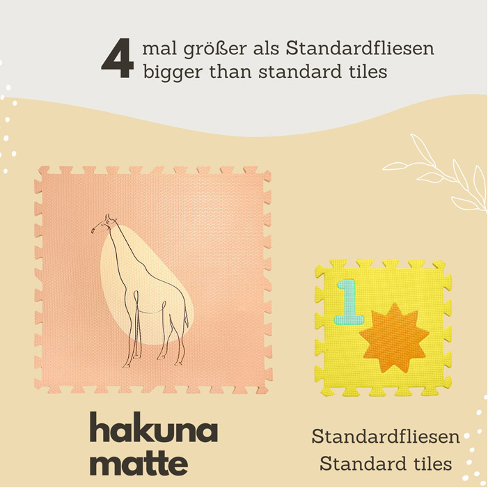 Il tappeto da gioco extra large è composto da sei quadrati di schiuma da 60×60 cm, quattro volte più grandi di un tappeto standard. Dieci bordi completano il set. Perfetto per gattonare, giocare, fare yoga a casa, fare fitness o per l’uso all’aperto.