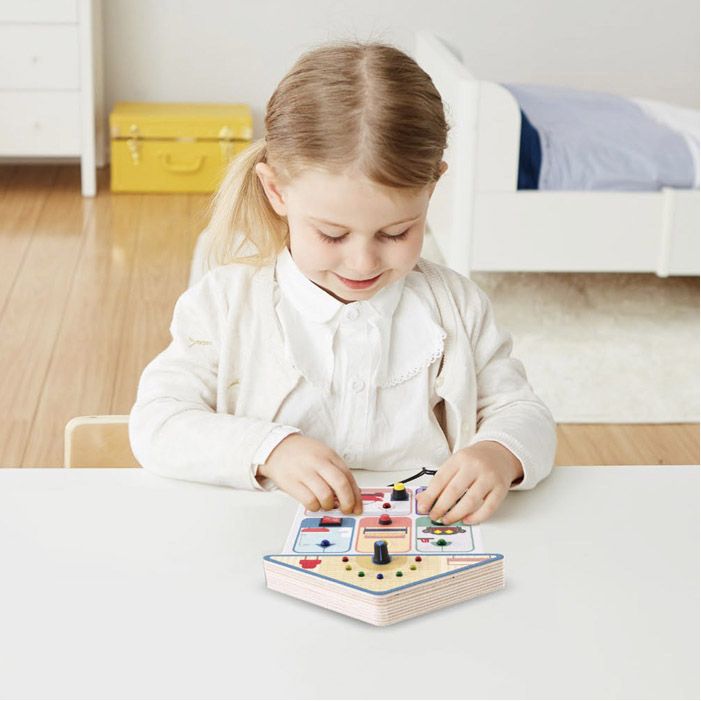 Con pulsanti da premere e spine da inserire, accompagnati da luci colorate, il bambino impara a capire le correlazioni e sviluppa l’immaginazione. Il gioco favorisce l’allenamento della motricità fine e delle abilità pratiche, risultando ideale anche per viaggi e momenti fuori casa.